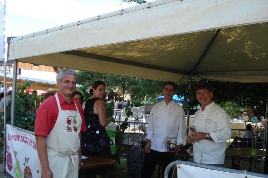 Le stand cuisine avec Mr Coves de la chambre d'agriculture et Mr Ravary et son équipe, les cuisiniers du restaurant du musée de Sarran venus initier les jeunes aux recettes culinaires à base de framboises.